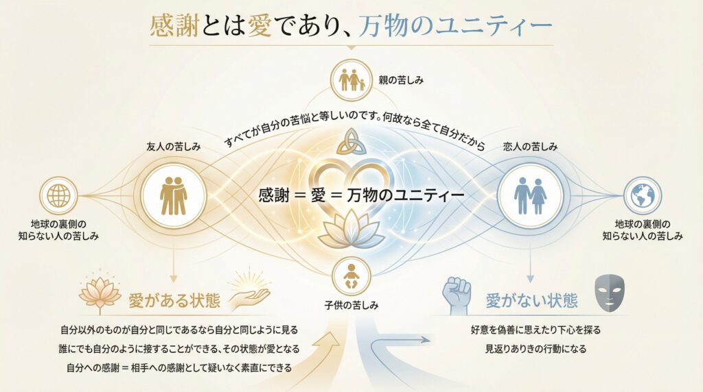 なので、誰にでも自分のように接することができるわけでその状態が「愛」となるのです。すべてを愛することができるわけです。その愛があるからこそ自分に感謝することは、相手に感謝することと同一であり、疑いなく素直にできることになるのです。