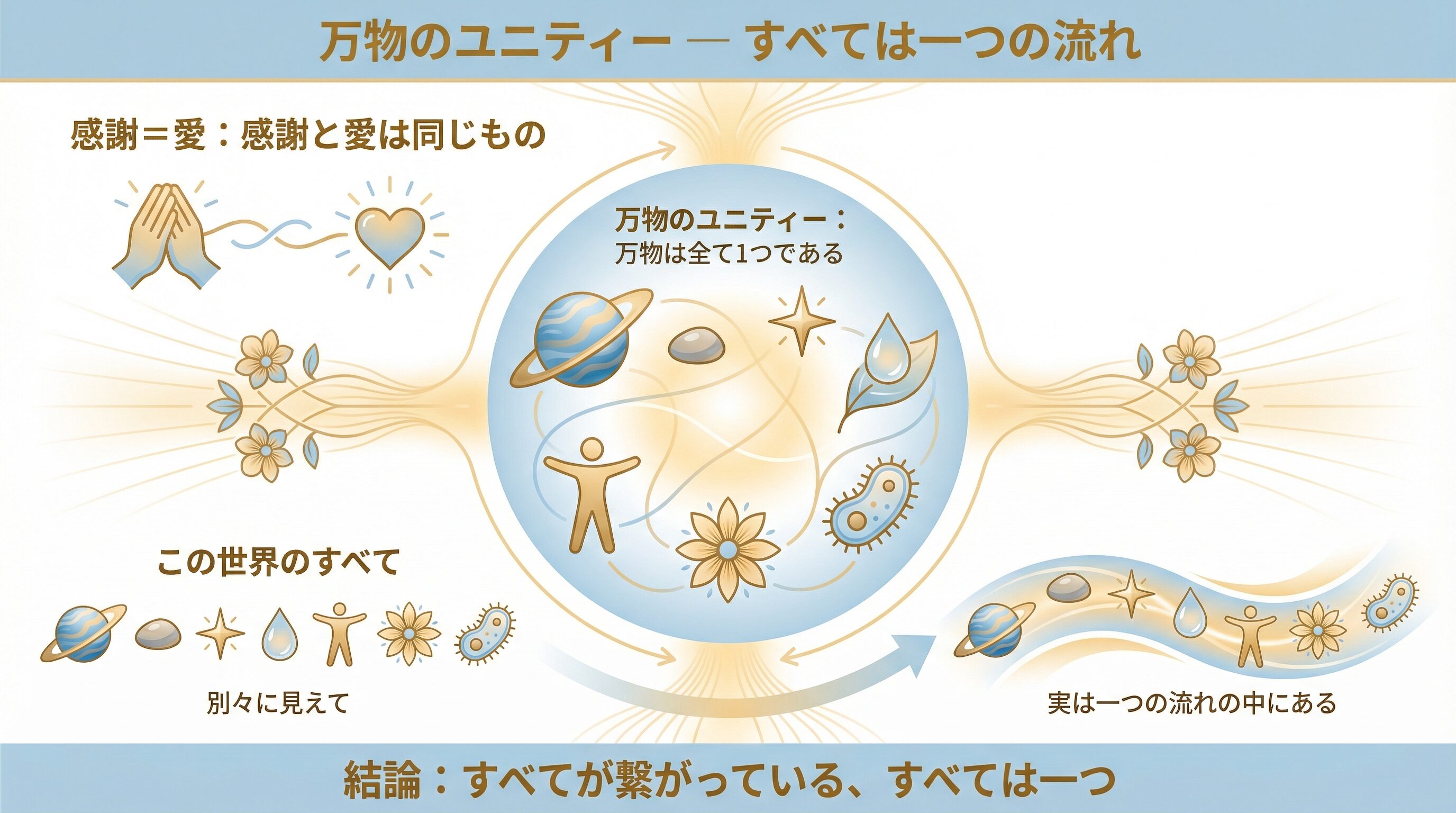 では、愛とは何かというと、ドラマのようなラブストーリーはその一部に過ぎずこれももっと深い意味があるのです。それは、万物のユニティー。