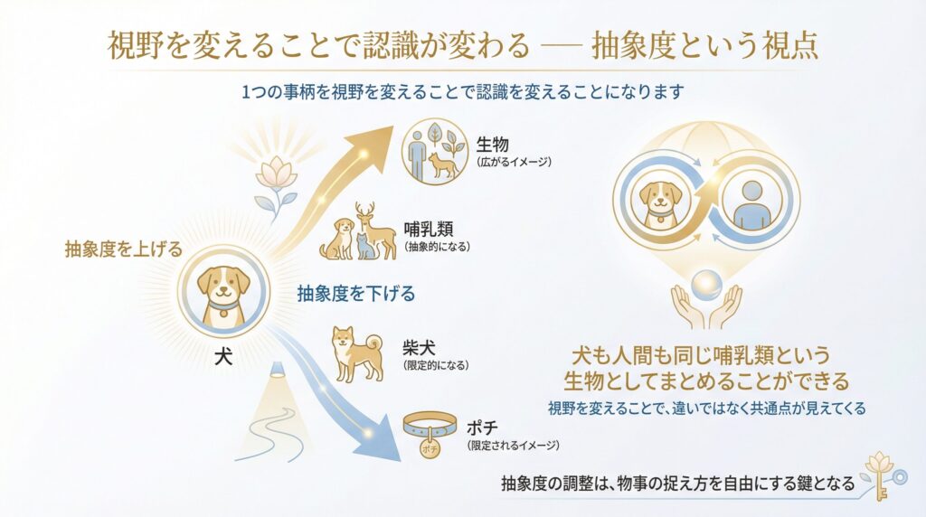 例えば、目の前に犬がいます。抽象度を下げれば、柴犬となります。さらに下げると、友人Aさんが飼っているポチとなります。どんどん限定的になっていきます。