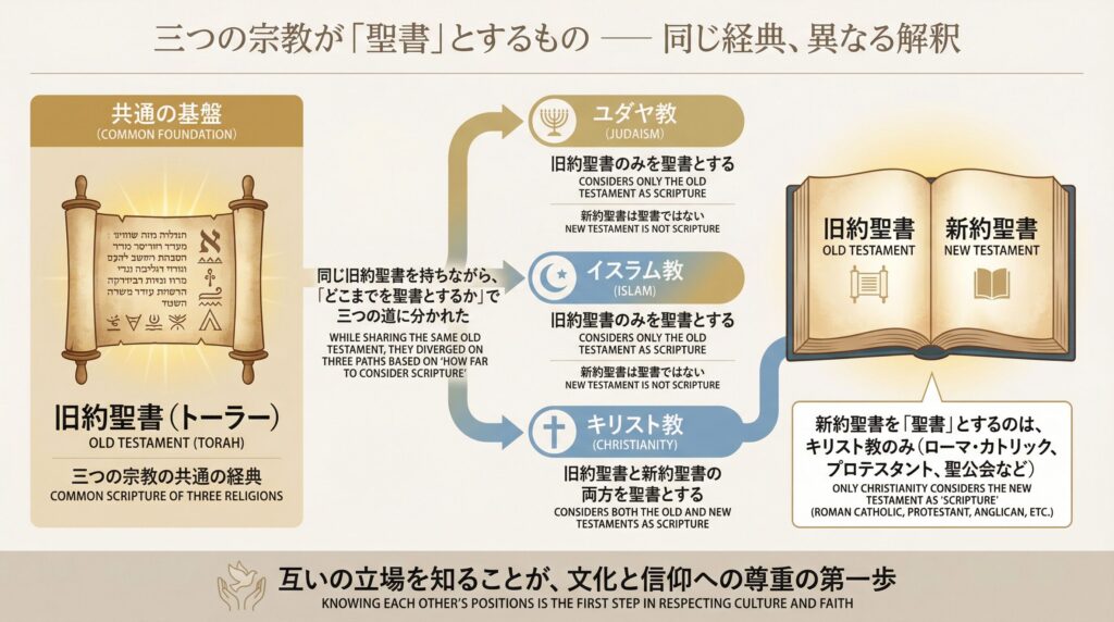 大きく考えた場合、キリスト教の聖書とは「旧約聖書」と「新約聖書」のことである。ユダヤ教とイスラム教では、新約聖書を聖書とはみなさず、いわゆる「旧約聖書」のみを聖書として認めている。これが大まかな異同である。