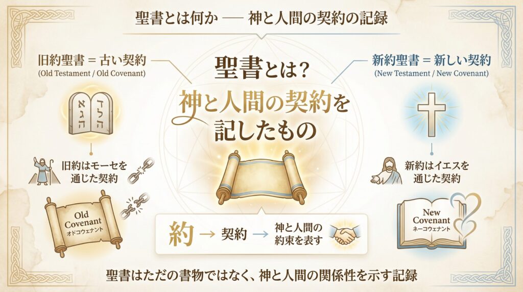 では、そもそも旧約、新約含めて聖書とは何かというと一言でいうと神と人間の契約を記したものとなります。