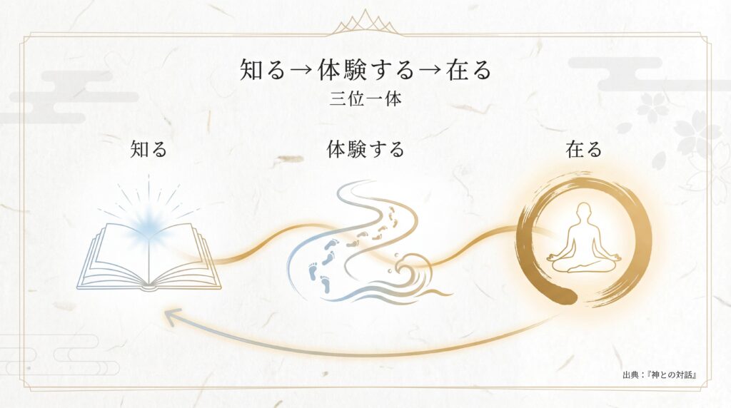 「知る」こと、「体験する」こと、何者かで「在る」ことの順に発達し、進化する。これが聖なる三位一体、神の三位一体である。