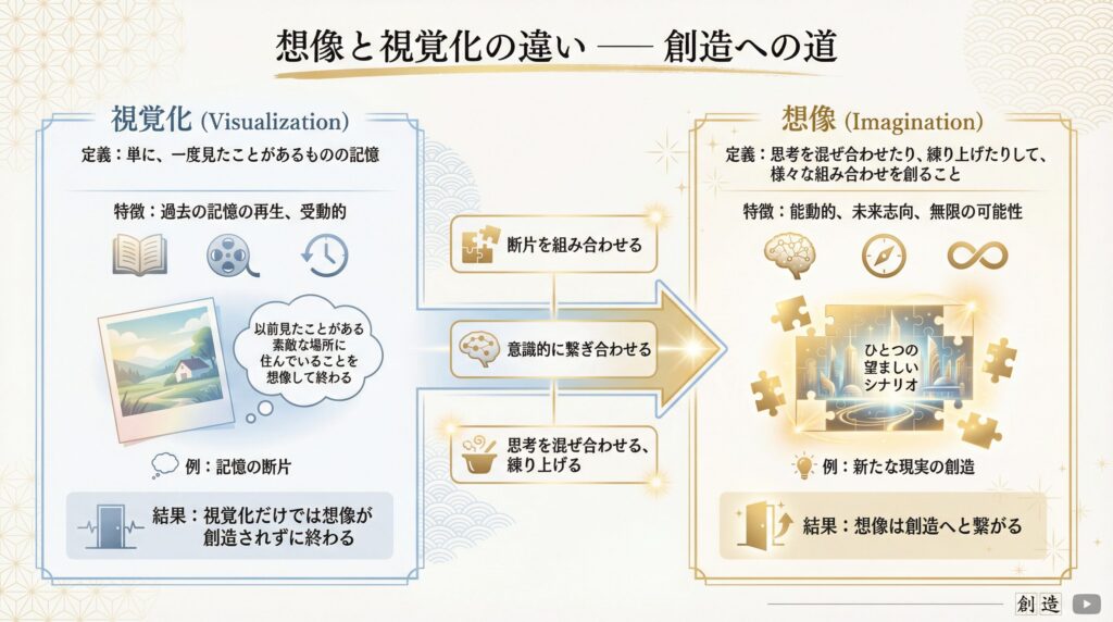 これは正確には想像ではなく、単なる視覚化になります。なので、それでは想像が創造されずに終わります。