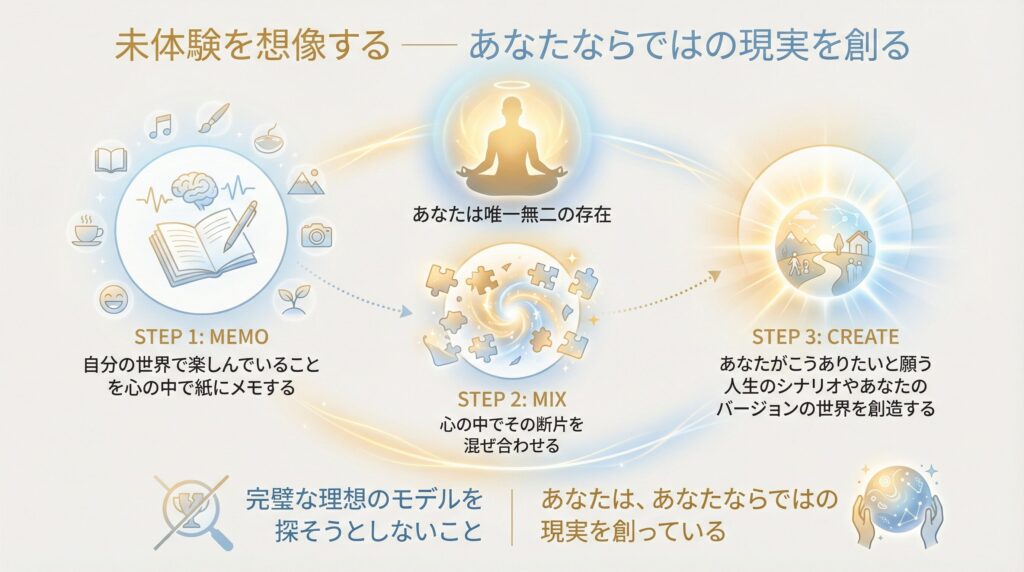 自分の世界で楽しんでいることを心の中で紙にメモして、心の中でその断片を混ぜ合わせて、あなたがこうありたいと願う人生のシナリオやあなたのバージョンの世界を創造するのです。その時に、完璧な理想のモデルを探そうとしないことです。あなたは唯一無二の存在なのだし、あなたは、あなたならではの現実を創っているですから。