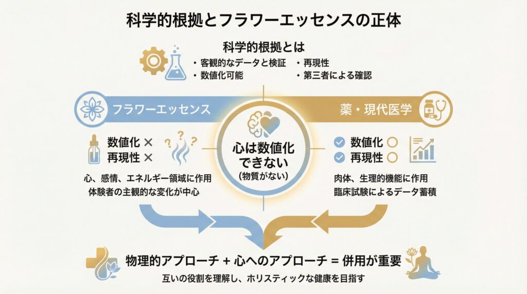 科学的根拠とは数値化され再現性のあること。ただし、フラワーエッセンスには数値化できるものでも再現性があるものでもありません。