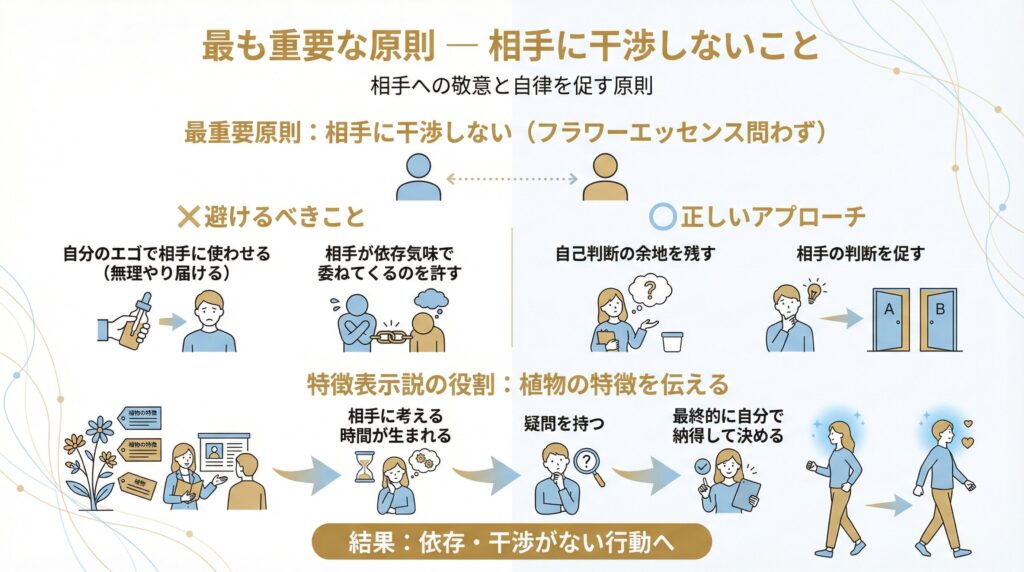 そして、納得した上でフラワーエッセンスの使用を自身で決めたときに、依存や干渉がない行動となるのです。